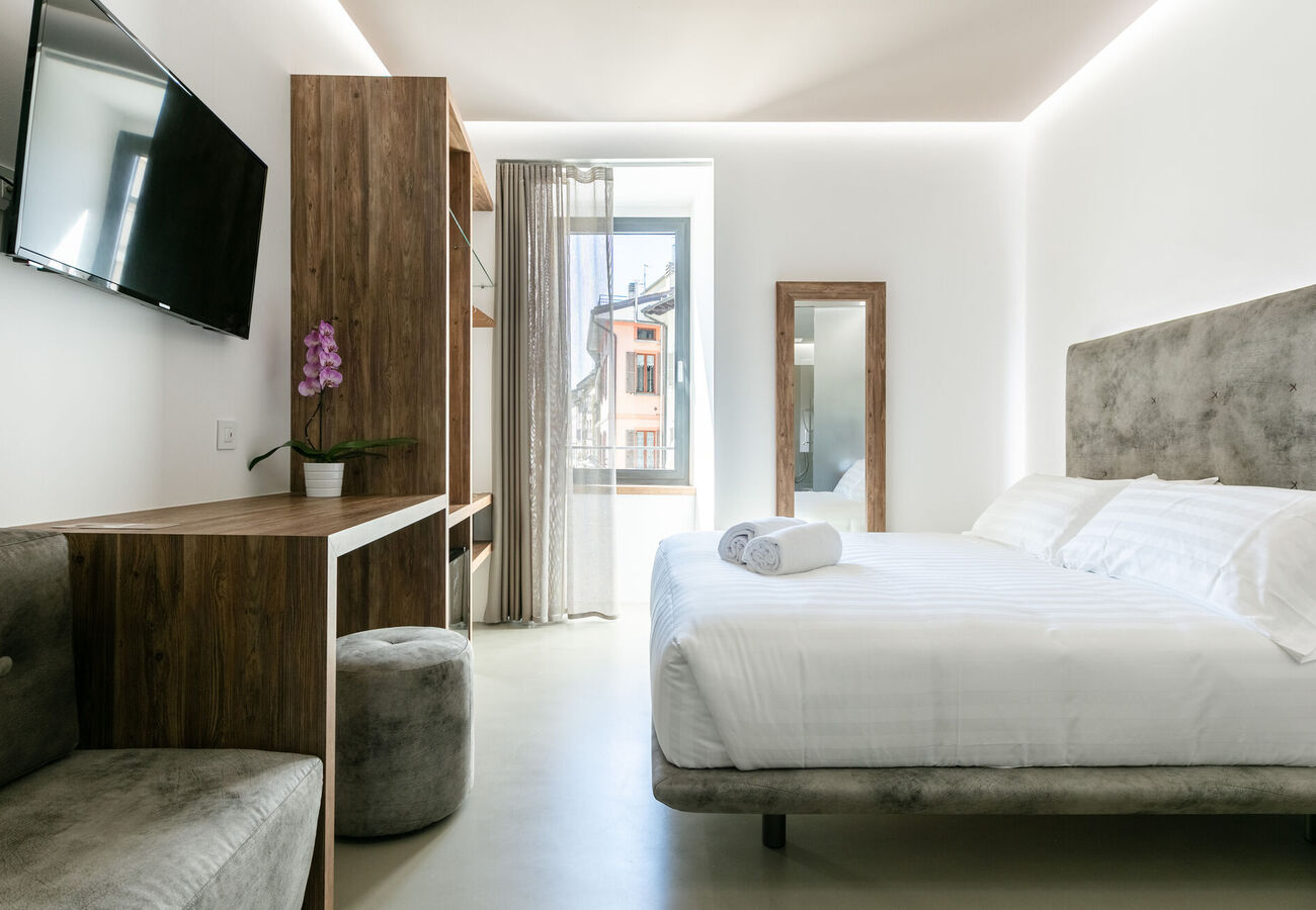 Arredata in stile minimalista con materiali naturali di pregio e sita al primo piano con viste su piazza Cavour, offre agli ospiti un ambiente accogliente ed elegante in cui rilassarsi e godersi la vacanza a Tirano.