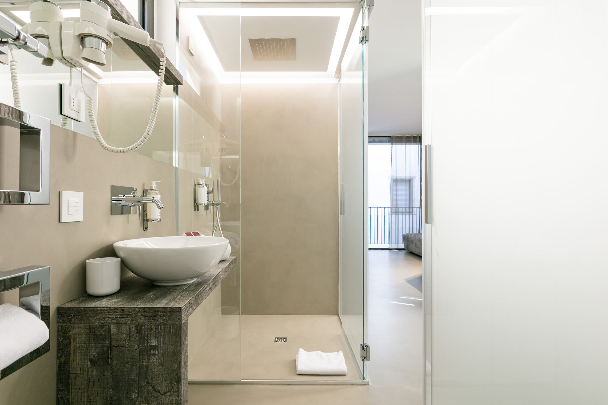 Situata al primo piano in area appartata con affaccio sulla corte interna, vicino alla terrazza solarium, offre agli ospiti un ambiente ampio ed elegante in cui rilassarsi e godersi la vacanza a Tirano. È arredata in stile minimalista con materiali naturali di pregio quali legno locale, vetro e ferro.